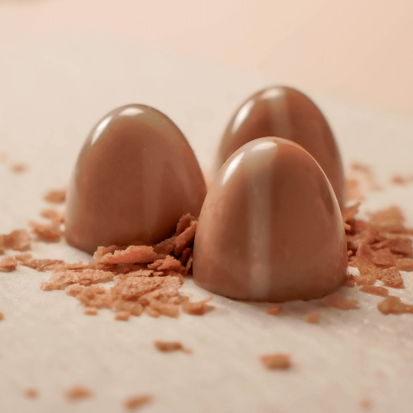 Let the silky embrace of caramelized chocolate melt on your tongue, unveiling delicate layers of crispy feuilletine. A perfect balance of buttery crunch and velvety sweetness, each bite is a slow, tantalizing dance of texture and taste. Savor the golden moment—pure pleasure in every bite.