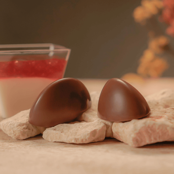 A smooth, creamy strawberry cheesecake filling encased in rich milk chocolate, offering a perfect blend of tangy sweetness and velvety indulgence. Each bite is a refined escape into a world of luxurious flavor.