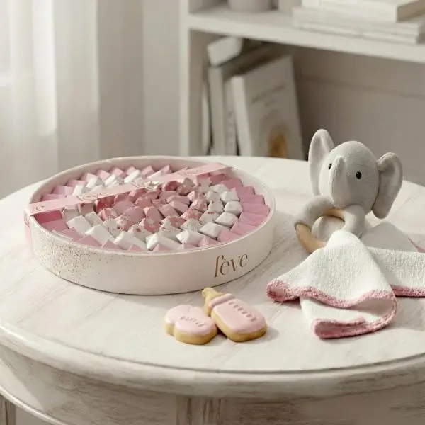 Elegance comes full circle with L’Orbe Rosé, an exquisite tribute to new beginnings. Drawing inspiration from the soft glow of a morning garden, this collection features a delicate mosaic of sweets in petal pink, warm cream, and shimmering rose. Housed in our signature minimalist round tray, the Rosée edition embodies a sense of gentle wonder. The contrast between the contemporary speckled finish and the soft, velvety tones of the arrangement makes it a breathtaking centerpiece for any celebration of her arrival.