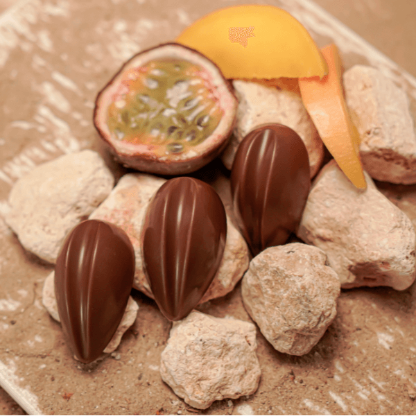 Lush mango and tangy passionfruit caramel flow beneath a smooth milk chocolate shell, creating a perfect balance of bright, golden sweetness and creamy indulgence. A tropicaldelight in every bite.